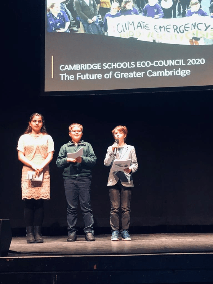 Presentation by Luana, Nico and Harry representatives of the Cambridge Schools’ Eco Council at the Cambridge Corn Exchange