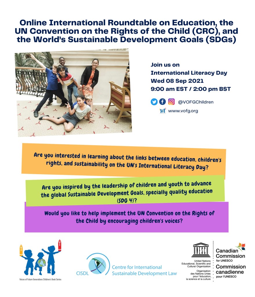 The International Roundtable on Education, hosted jointly by the Voices of Future Generations Children’s Initiative, in partnership with the Canadian Commission for UNESCO, the Centre for International Sustainable Development Law (CISDL), and experts from the University of Cambridge, McGill University, and the University of Nairobi, among others, convenes teachers, child and youth leaders, mentors and experts on intergenerational equity, children’s rights and sustainable development for an interactive dialogue to raise awareness and speak up for education, children’s rights and the global Sustainable Development Goals.
