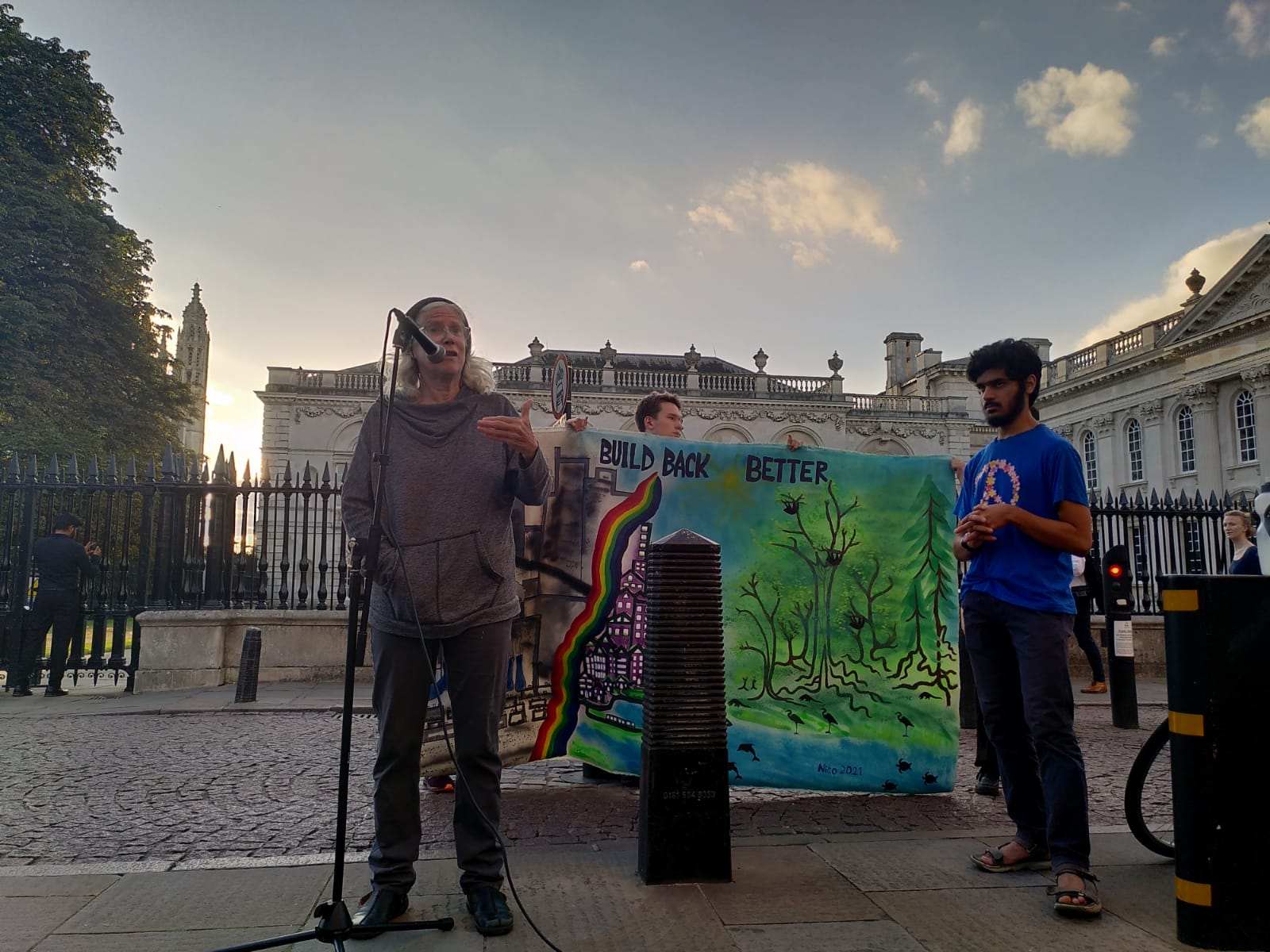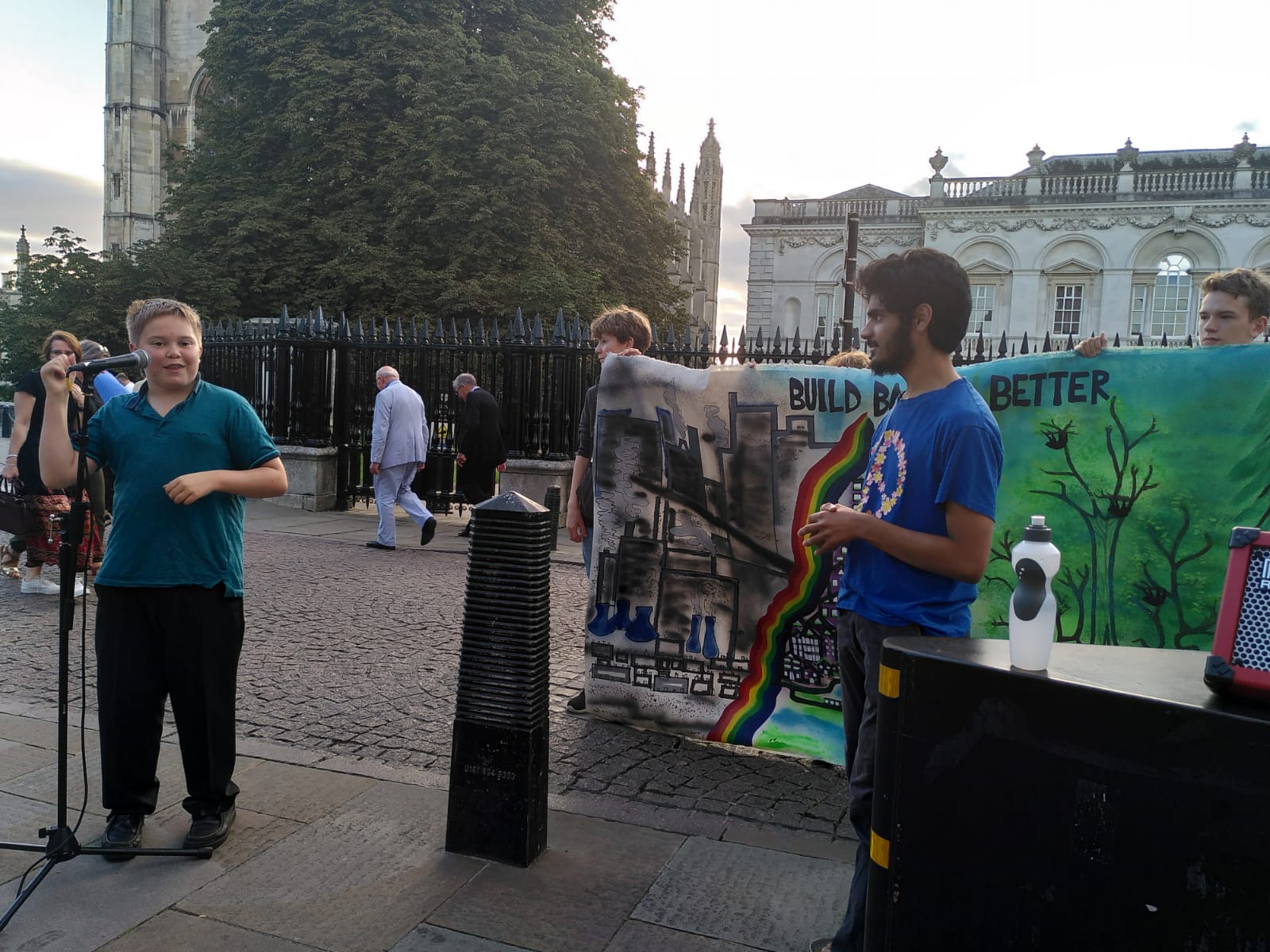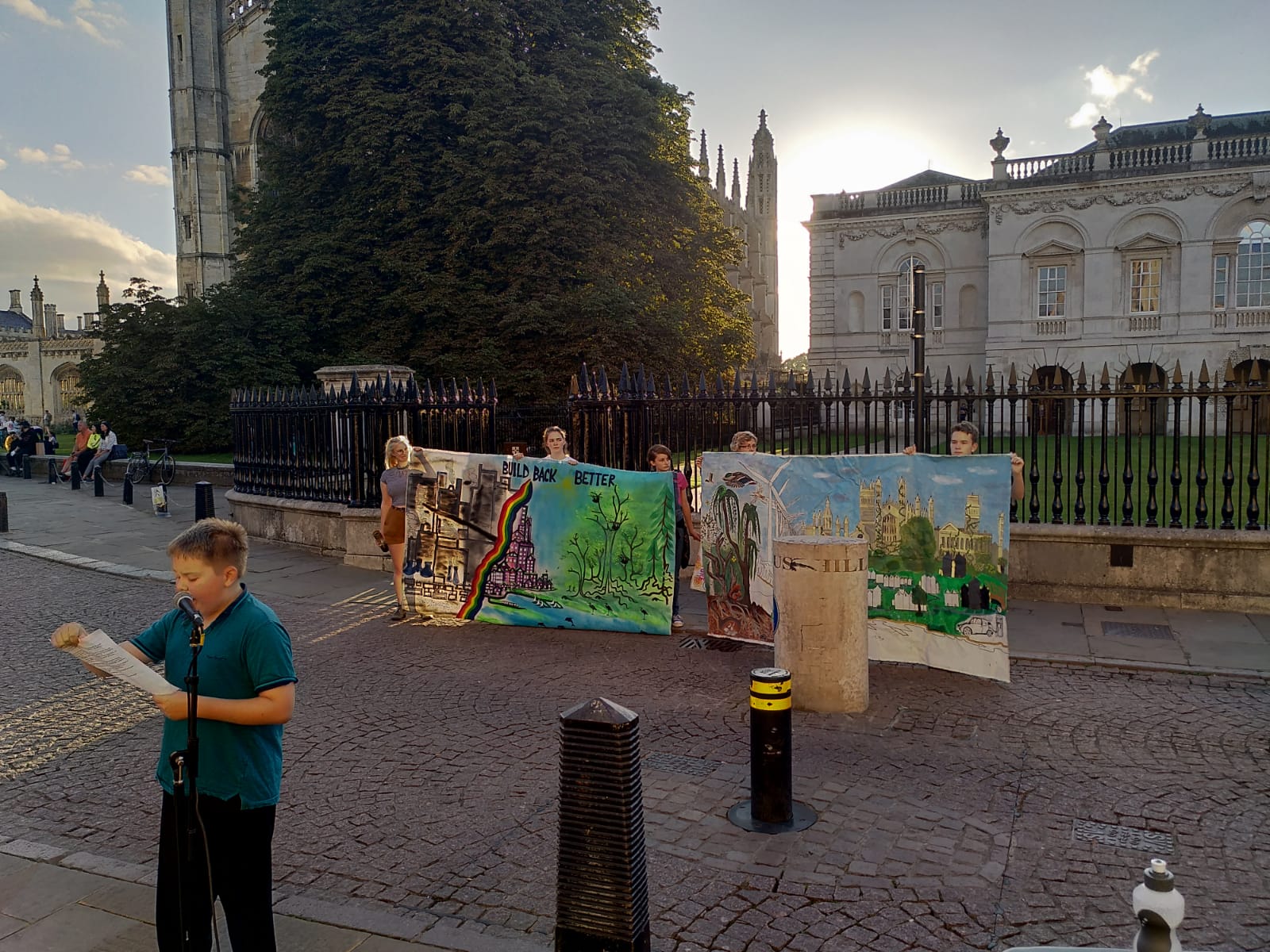 “As the world slowly reawakens from a horrid pandemic, youth strikers across the world are rising up with actions to say #BuildBackBetter,” says the schools eco council, as speakers repeated their concerns at the prospect of having no water in Cambridge, and demands for “a Green New deal now!” on King’s Parade.