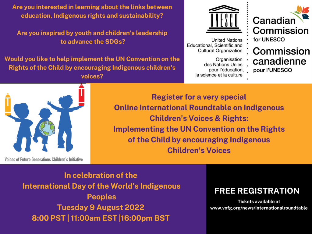 Register now for a very special online International Roundtable on Indigenous Children’s Voices & Rights, which takes place on Tuesday 9 August 2021 at 8:00 EST | 11:00 EST |16:00 BST in celebration of the International Day of the World’s Indigenous Peoples.