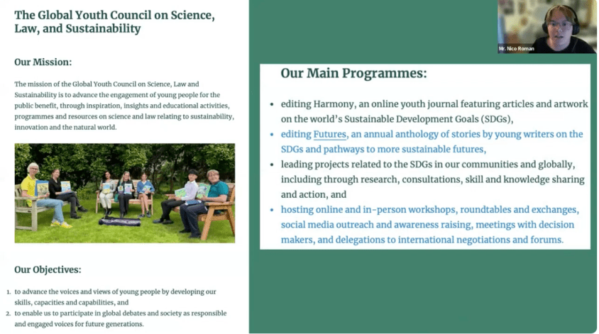 I was honoured to speak at the Leadership Roundtable: Youth Voices in Biodiversity Governance as part of the Biodiversity Law and Governance Day during COP 16. Hosted by the Voices of the Future Generations Children’s Initiative (VoFG CI), the Global Youth Council on Science, Law & Sustainability (GYC), and the Youth Negotiators Academy (YNA). I had the opportunity to share my passion for sustainability and youth advocacy.
